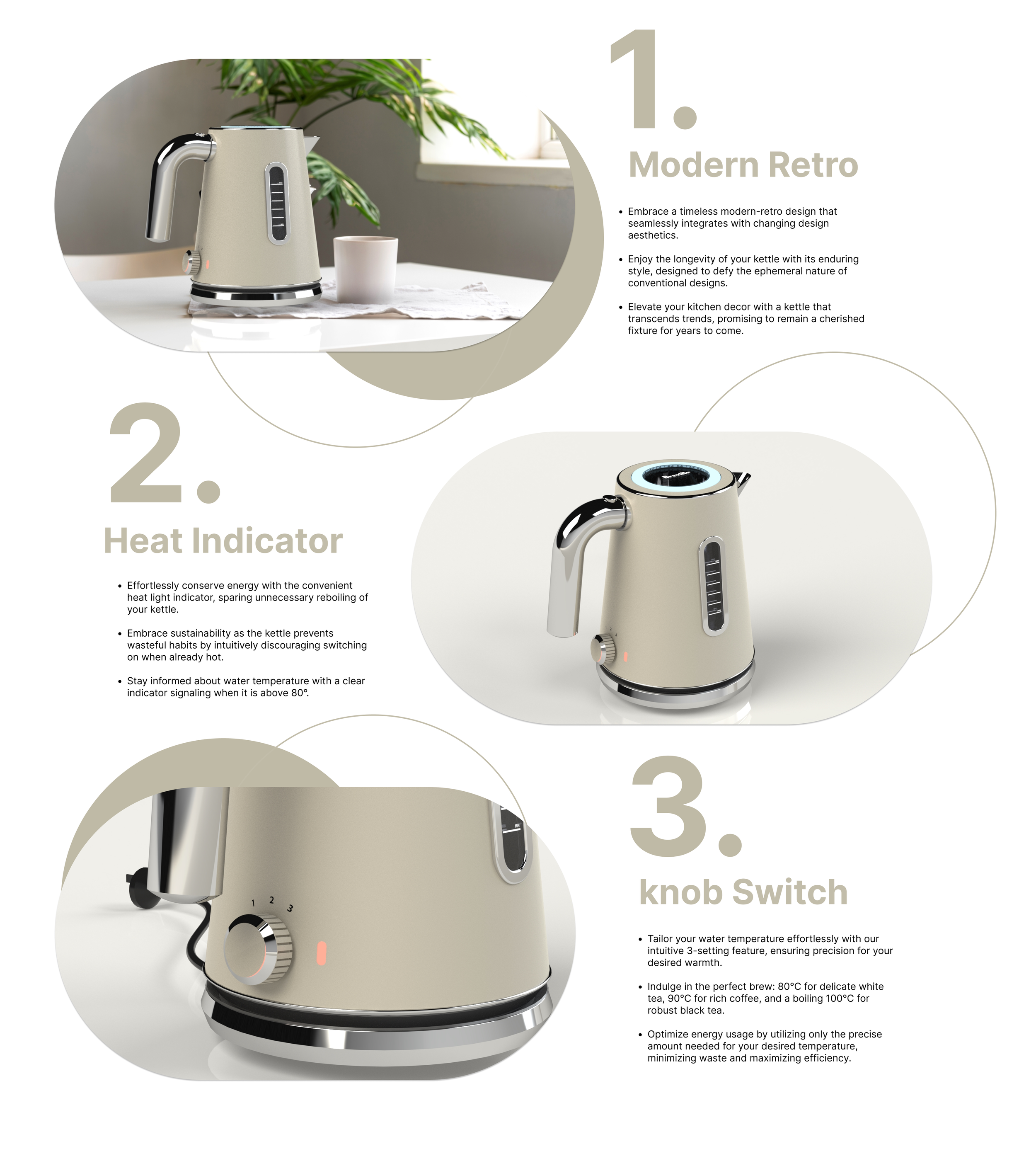 How might we improve the visual aesthetics of kettles to seamlessly integrate into any household, while simultaneously enhancing sustainability by integrating smart and user-friendly features?