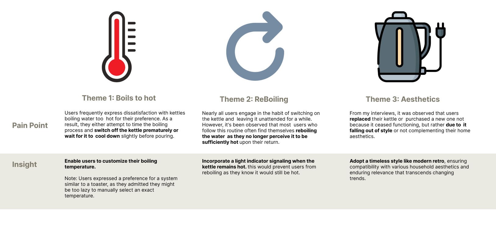 Based on interviews with users, it's apparent that when selecting a kettle, functionality and suitability take a back seat to its aesthetic compatibility with home decor. Moreover, instead of solely focusing on enhancing sustainability features, it may be more impactful to consider user behaviour patterns and encourage subconscious sustainable decision-making.