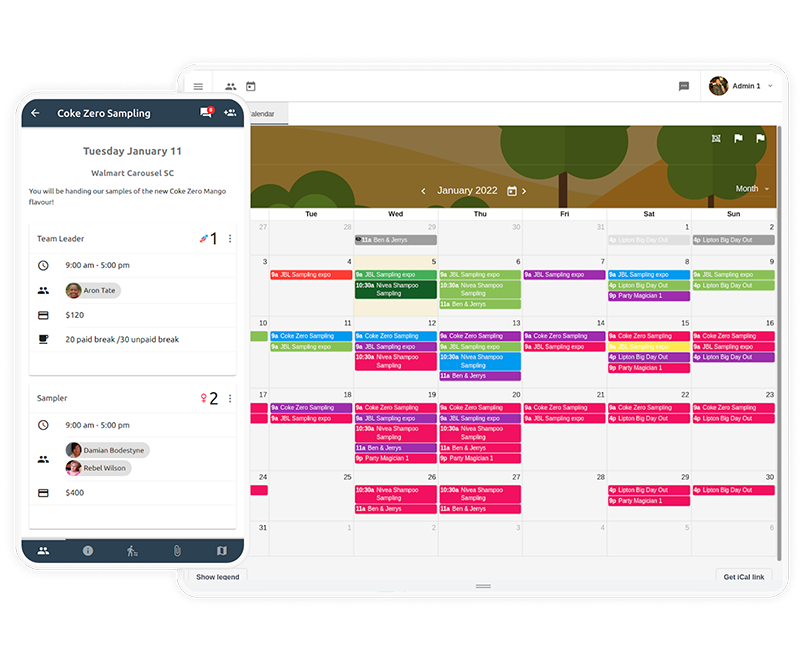 A personalized calendar that allows you to view your scheduled shifts and also displays available shifts on specific days.