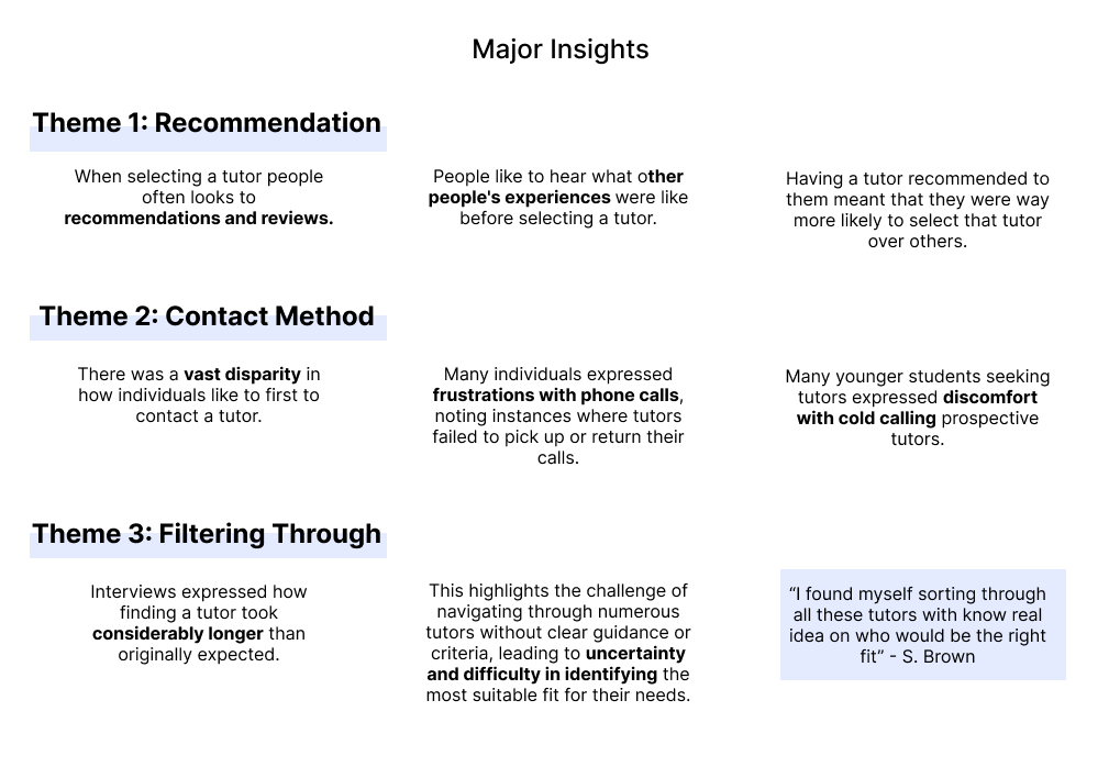 Based on the trends in my affinity map, I noted how other tutor finder platforms only listed tutors and gave no real consideration to what people look for in a tutor. Interviewees said that this meant finding a tutor took a lot longer than expected.